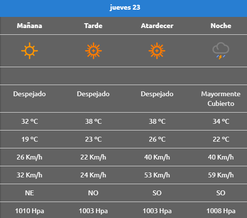 ¡38 grados!: mucho calor e inestabilidad para este jueves Alto Valle Regionales Rio Negro Roca por rocanoticias - 23/12/20210 ¡38 grados!: mucho calor e inestabilidad para este jueves:Foto – GentilezaSegún la Autoridad Interjurisdiccional de Cuencas (AIC), el pronóstico del tiempo para los próximos días indica: Hoy, «jueves 23, inestable, tormentas aisladas y períodos de viento moderado por la tarde y noche. El viernes 24, viento débil del sudoeste, soleado. Se mantienen las condiciones de calor y sol durante el fin de semana». (Gentileza mediosdelaire)Estamos en Redes Sociales también con información al instante! Facebook.com/RocaNoticiasOK Twitter.com/RocaNoticiasOK Youtube.com/channel/UCBynBbRhpBSthnlTdU0ugYg Instagram.com/RocaNoticiasOK Telegram.me/RocaNoticiasCompartir esta noticia:Tweet Haz clic para compartir en WhatsApp (Se abre en una ventana nueva) WhatsApp Haz clic para compartir en Telegram (Se abre en una ventana nueva) Telegram Haz clic para compartir en Reddit (Se abre en una ventana nueva) Reddit Haz clic para imprimir (Se abre en una ventana nueva) Imprimir Relacionado...