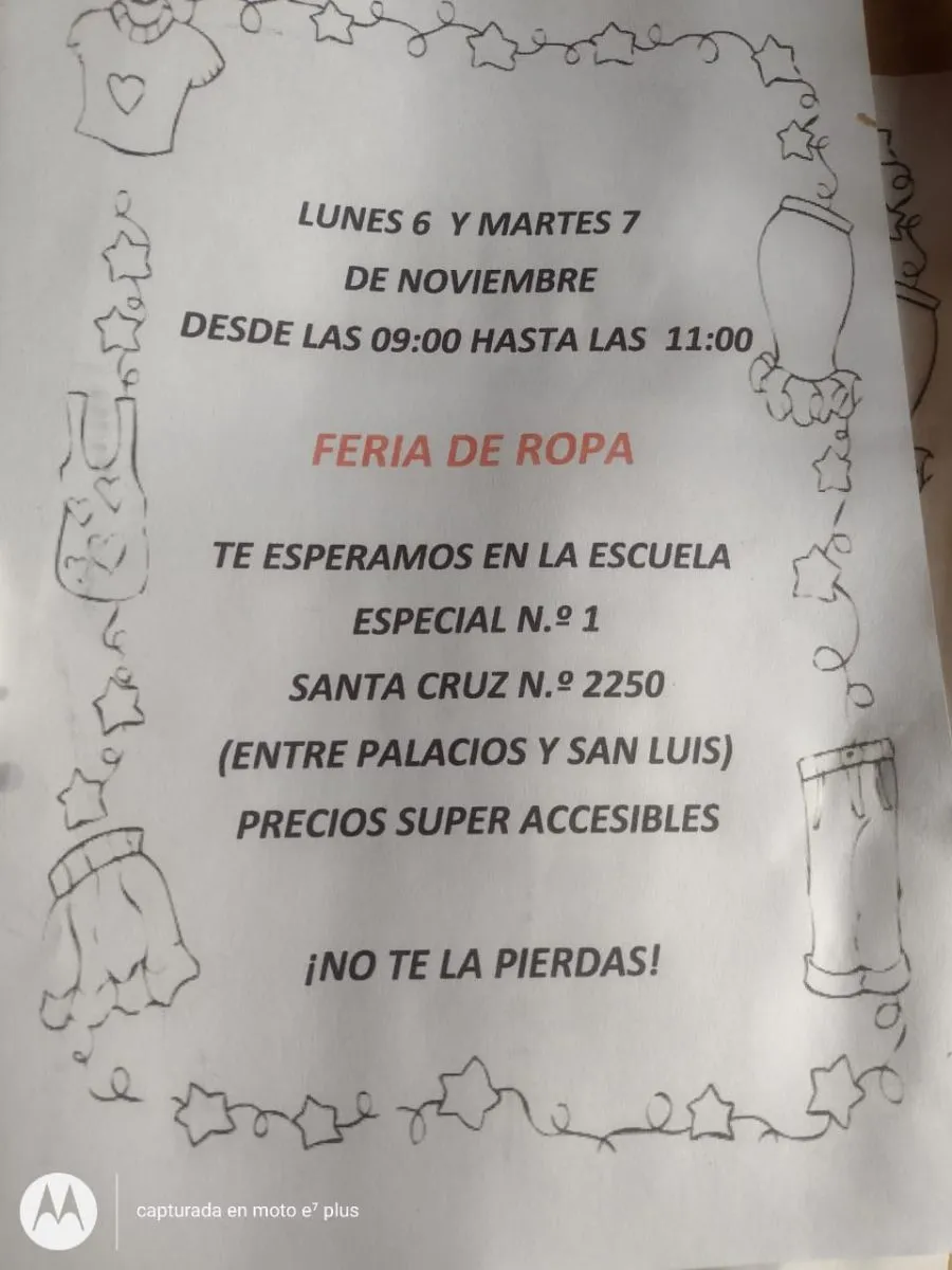 Acércate a la Feria solidaria de Ropa en la escuela especial 1 Regionales Rio Negro Roca por rocanoticias - 06/11/20230 La escuela especial 1 de General Roca, invita a la comunidad a una feria de ropa solidaria que se realiza los días 6 y 7 de noviembre en el horario de 9 a 11.Lo recaudado, será destinado a festejar el cumpleaños de las personas que asisten al establecimiento.La escuela se encuentra ubicada en calle Santa Cruz 2250.En resumen:Resumen en español del contenido en 200 palabras La escuela especial 1 de General Roca, invita a la comunidad a una feria de ropa solidaria que se realiza los días 6 y 7 de noviembre en el horario de 9 a 11.Lo recaudado, será destinado a festejar el cumpleaños de las personas que asisten al establecimiento.La escuela se encuentra ubicada en calle Santa Cruz 2250. en españolRocaNoticias.com en Redes Sociales con información al instante! Facebook.com/RocaNoticiasOK Twitter.com/RocaNoticiasOK Youtube.com/@RocaNoticias Instagram.com/RocaNoticiasOK Telegram.me/RocaNoticias TikTok.com/@RocaNoticiasCompartir esta noticia:Tweet Haz clic para compartir en WhatsApp (Se abre en una ventana nueva) WhatsApp Haz clic para compartir en Telegram (Se abre en una ventana nueva) Telegram Haz clic para compartir en Reddit (Se abre en una ventana nueva) Reddit Haz clic para imprimir (Se abre en una ventana nueva) Imprimir Relacionado...