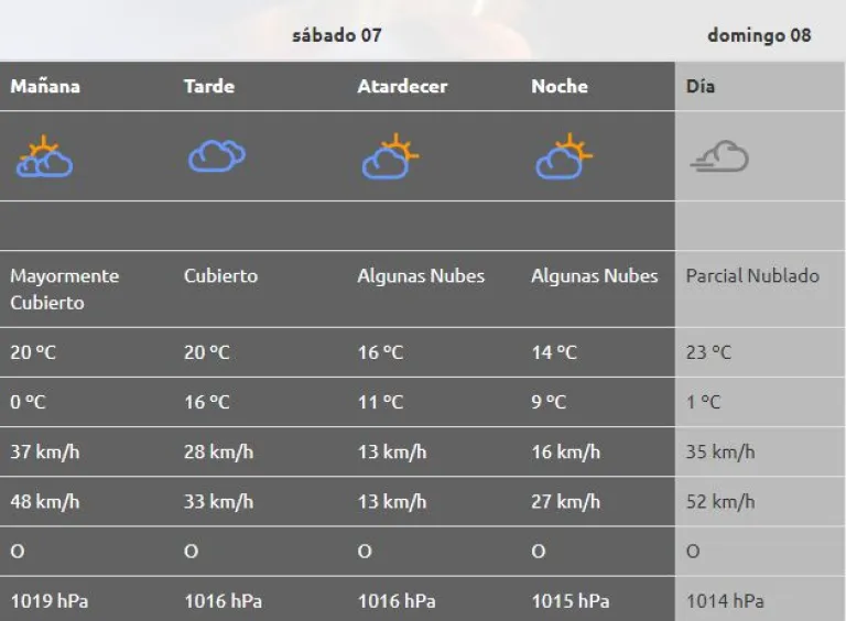Clima: viento y más viento… ¿Este sábado siguen las fuertes ráfagas en Roca? Regionales Roca por rocanoticias - 07/10/20230 Según la Autoridad Interjurisdiccional de las Cuencas, este sábado 7 de octubre tendrá el siguiente pronóstico:Para la zona de valles y meseta nubosidad variable, tiempo bueno. Para la Norpatagonia periodos de vientos moderados con alguna ráfaga fuerte del sudoeste, se mantiene hasta el fin de semana. Próximos días leve ascenso de la temperatura.En resumen:Resumen del contenido en 180 palabras Según la Autoridad Interjurisdiccional de las Cuencas, este sábado 7 de octubre tendrá el siguiente pronóstico:Para la zona de valles y meseta nubosidad variable, tiempo bueno. Para la Norpatagonia periodos de vientos moderados con alguna ráfaga fuerte del sudoeste, se mantiene hasta el fin de semana. Próximos días leve ascenso de la temperatura. en español Resumen del contenido en 180 palabras Según la Autoridad Interjurisdiccional de las Cuencas, este sábado 7 de octubre tendrá el siguiente pronóstico:Para la zona de valles y meseta nubosidad variable, tiempo bueno. Para la Norpatagonia periodos de vientos moderados con alguna ráfaga fuerte del sudoeste, se mantiene hasta el fin de semana. Próximos días leve ascenso de la temperatura. en españolRocaNoticias.com en Redes Sociales con información al instante! Facebook.com/RocaNoticiasOK Twitter.com/RocaNoticiasOK Youtube.com/@RocaNoticias Instagram.com/RocaNoticiasOK Telegram.me/RocaNoticias TikTok.com/@RocaNoticiasGentileza anrCompartir esta noticia:Tweet Haz clic para compartir en WhatsApp (Se abre en una ventana nueva) WhatsApp Haz clic para compartir en Telegram (Se abre en una ventana nueva) Telegram Haz clic para compartir en Reddit (Se abre en una ventana nueva) Reddit Haz clic para imprimir (Se abre en una ventana nueva) Imprimir Relacionado...