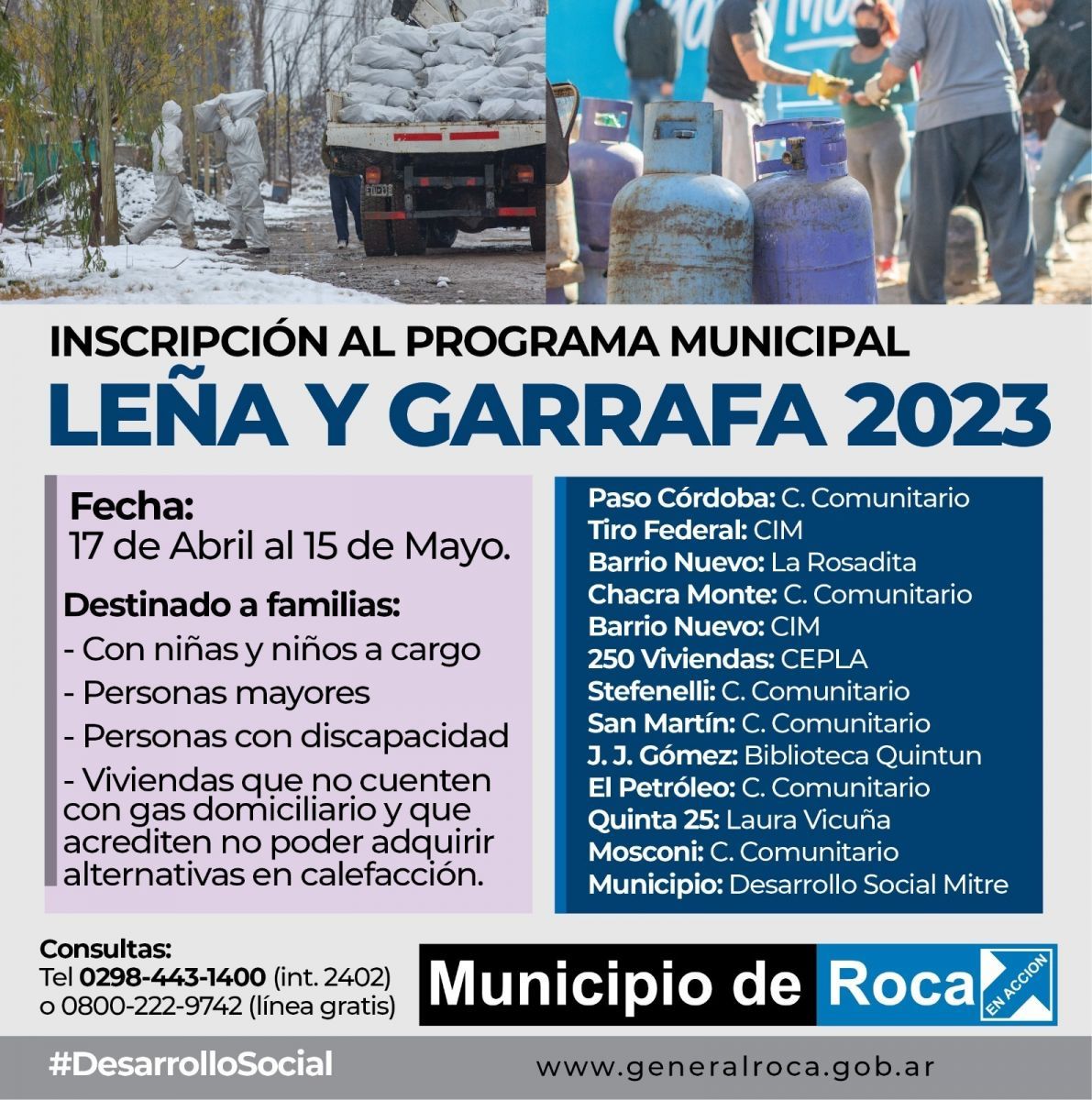 Continua abierta la inscripción para acceder a leña y garrafa gratis Regionales Rio Negro Roca por rocanoticias - 25/04/20230 La inscripción a estos Programas tiene como fin acompañar a aquellas familias que aún no cuentan con el servicio de gas en la vivienda.El programa está destinado únicamente a familias: con niñas y niños a cargo de su cuidado personal, personas mayores y/o personas con discapacidad y que, por su situación económica, acreditan la necesidad de la asistencia.Las inscripciones se realizarán de manera presencial en las siguientes unidades barriales, los siguientes días y horarios:*Paso Córdoba: Centro Comunitario, Ercolani 7010 – Lunes y jueves De 8 a 12hs.*CIM Tiro Federal: calle Palacios esquina Don Bosco – Martes y jueves De 8 a 12hs.*Barrio Nuevo: La Rosadita, San Juan 3657 – Lunes, martes y jueves de 8 a 12hs.*Chacra Monte: Centro Comunitario, Las Retamas e Ismael Basse – Martes, miércoles y viernes de 8 a 11hs.*CIM Barrio Nuevo: Rosario de Santa Fe y Cauquén – Lunes, Miércoles y Viernes de 8 a 12hs.*250 Viviendas CEPLA Ushuaia y Del Libertador – De lunes a viernes de 8 a 12hs.*Stefenelli: Centro Comunitario Maglioni, Vintter 740 – Viernes de 8 a 12 hs*San Martín: Centro Comunitario, Tres Arroyos 1846 – Martes de 8 a 12 hs*JJ Gómez: Biblioteca Quintun, Mitre 5340 – Lunes, miércoles y viernes de 8 a 12hs.*Petróleo: Centro Comunitario – jueves de 8 a 12hs.*Quinta 25: Laura Vicuña, Maipú 3920 – Miércoles y Viernes de 8 a 12hs.*Mosconi: Centro Comunitario Elias Zettone 902 -Miércoles de 8 a 12hs.*Municipio: Desarrollo Social Mitre 710 – De Lunes a Viernes de 7.30 a 14hsPara consultas comunicarse al teléfono: 4431400 interno 2402 o al 0800-222-9742.En resumen:El municipio de General Roca, en Argentina, ha abierto la inscripción para el Programa de Gas Social, que tiene como objetivo acompañar a aquellas familias que aún no cuentan con el servicio de gas en la vivienda. Está destinado exclusivamente a familias con niños a cargo, mayores o discapacitados, que acrediten la necesidad de asistencia debido a su situación económica. Las inscripciones podrán realizarse de forma presencial en distintas unidades barriales y se puede obtener más información llamando al teléfono: 4431400 interno 2402 o al 0800-222-9742.RocaNoticias.com en Redes Sociales con información al instante! Facebook.com/RocaNoticiasOK Twitter.com/RocaNoticiasOK Youtube.com/@RocaNoticias Instagram.com/RocaNoticiasOK Telegram.me/RocaNoticias TikTok.com/@RocaNoticiasCompartir esta noticia:Tweet Haz clic para compartir en WhatsApp (Se abre en una ventana nueva) WhatsApp Haz clic para compartir en Telegram (Se abre en una ventana nueva) Telegram Haz clic para compartir en Reddit (Se abre en una ventana nueva) Reddit Haz clic para imprimir (Se abre en una ventana nueva) Imprimir Relacionado...