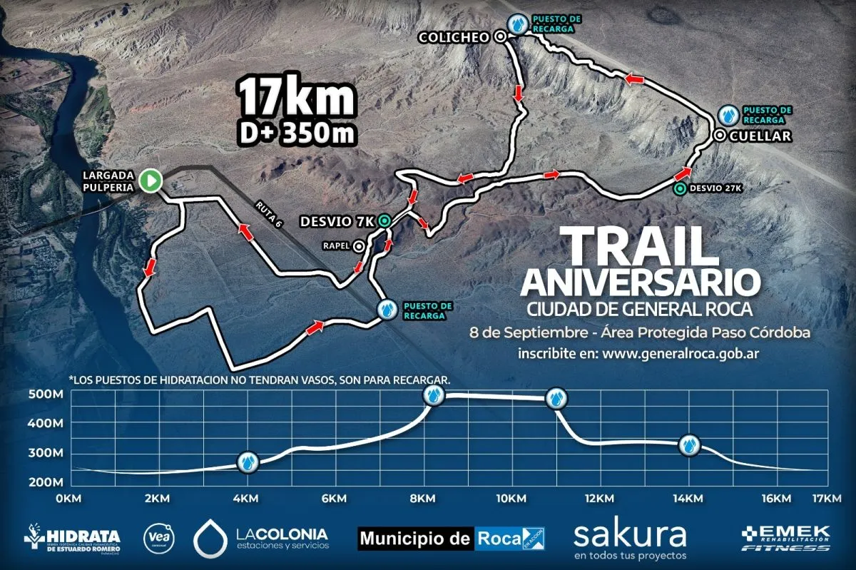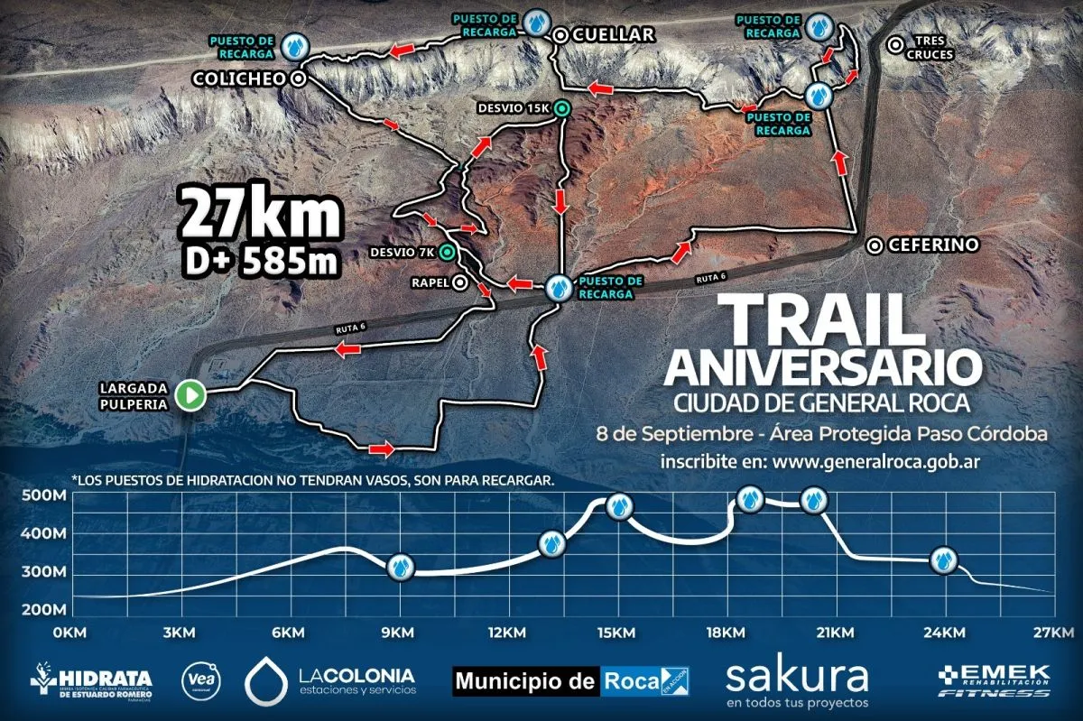 Corrida Aniversario en las bardas: ¿Cuáles son los precios de inscripción y el recorrido? Regionales Roca por rocanoticias - 12/08/20240 Con las inscripciones ya abiertas a la aventura del Trail Aniversario Roca 2024, este año con un desafío distinto en las bardas del Área Nacional Protegida ANP de Paso Córdoba, se definieron los circuitos correspondientes a las tres distancias competitivas.La carrera competitiva para adolescentes y adultos tendrá tres distancias de participación:• 7km con un desnivel de 110 metros• 17km con un desnivel de 350 metros• 27km con un desnivel de 585 metrosLa largada será desde la zona de La Pulpería hacia el Mangrullo,tendrá altimetría, tanto en la distancia larga como intermedia. Los 7km tendrá un desnivel de 110 metros // Imagen Municipio de Roca.Desde el área de deportes aseguran que «las tres distancias tendrán todos los condimentos que les gusta a los corredores/as de Trail: por momentos los circuitos trabados, con arenales, cañadones y la piedra que resalta el terreno».Los 17km tendrán un desnivel de 350 metros // Imagen Municipio de Roca.Los puntos clave por los que se pasará, dependiendo de la distancia a recorrer, será: zona de las Tres Cruces, zona del Ceferino, Cuellar y Colicheo. En este sentido, cabe destacar que todo el circuito estará marcado, con banderilleros en cada punto clave.Los 27km tendrán un desnivel de 585 metros // Imagen Municipio de Roca.Se contará además con puestos de recarga con bebidas isotónicas para todos los circuitos. Para ello, cada corredor/a deberá llevar su soft o vaso para recargar en los puestos, ya que no habrá vasos en los puestos.InscripciónesLas inscripciones para ambas modalidades ya se pueden realizar a través de la web municipal. Desde la organización se estableció una primera fase de inscripción, del 01/08/24 al 21/08/24, que será más económica que la segunda. del 25/08/24 al 01/09/24.Los precios son los siguientes: Hasta el 24 de agosto: 7 km $ 14 mil.15 km $ 18 mil.27 km $ 22 mil. Del 25 de agosto al 1 de septiembre: 7 km $ 17 mil.15 km $ 21 mil.27 km $ 25 mil.Además, el atleta tendrá la casaca del evento, su seguro del corredor y su medalla finished.Cross infantilSe recuerda también que el Trail Aniversario Roca contará con la modalidad Cross Infantil: Carrera recreativa (no competitiva) para niños/as de 6 a 15 años. Ellos podrán participar del evento de forma gratuita en un circuito por las Bardas acompañados de profesores/as.RocaNoticias.com en Redes Sociales con información al instante! Facebook.com/RocaNoticiasOK Twitter.com/RocaNoticiasOK Youtube.com/@RocaNoticias Instagram.com/RocaNoticiasOK Telegram.me/RocaNoticias TikTok.com/@RocaNoticiasGentileza anrCompartir esta noticia:Tweet Haz clic para compartir en WhatsApp (Se abre en una ventana nueva) WhatsApp Haz clic para compartir en Telegram (Se abre en una ventana nueva) Telegram Haz clic para compartir en Reddit (Se abre en una ventana nueva) Reddit Haz clic para imprimir (Se abre en una ventana nueva) Imprimir Relacionado...