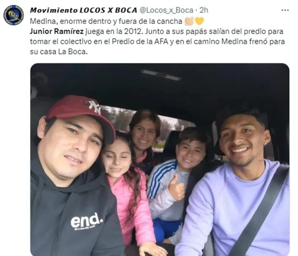 Desde la cuenta de Twitter del Movimiento Locos X Boca, se celebró el noble acto de Medina con estas palabras: «Medina, enorme dentro y fuera de la cancha. Junior Ramírez juega en la categoría 2012. Junto a sus padres salían del predio para tomar el colectivo en el Predio de la AFA y en el camino Medina frenó para llevarlo a su casa en La Boca».