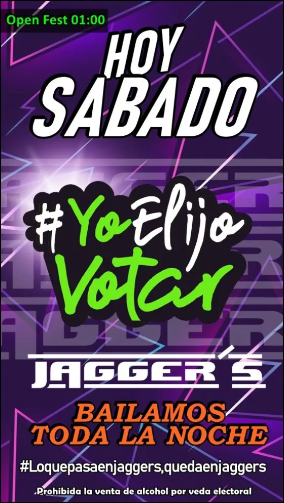 Fiesta sin alcohol: esta noche abre Jaggers Regionales Rio Negro Roca por rocanoticias - 21/10/20230 La discoteca roquense Jaggers, informó que abrirá sus puertas esta noche con una propuesta atípica, pero que permite divertirse igual. Este domingo 22/10, habrá elecciones presidenciales en Argentina, pero los boliches podrán abrir igual, siempre que respeten la prohibición de vender bebidas alcohólicas.Ante esta situación, los dueños de Jaggers, decidieron abrir con una propuesta distinta.El boliche ubicado en San Martín 969 de General Roca, abrirá a la 01.AM, y prepara un show de tragos sin alcohol, a base de frutas y helados. La música y la mística, estarán intactas.Desde Jaggers, agradecieron la posibilidad de que se les permita trabajar, atendiendo al difícil momento económico que se vive en el país, e invitan a la gente a divertirse sanamente hasta las 06 am.En resumen:Resumen en español del contenido en 200 palabrasLa discoteca roquense Jaggers, informó que abrirá sus puertas esta noche con una propuesta atípica, pero que permite divertirse igual. Este domingo 22/10, habrá elecciones presidenciales en Argentina, pero los boliches podrán abrir igual, siempre que respeten la prohibición de vender bebidas alcohólicas.Ante esta situación, los dueños de Jaggers, decidieron abrir con una propuesta distinta.El boliche ubicado en San Martín 969 de General Roca, abrirá a la 01.AM, y prepara un show de tragos sin alcohol, a base de frutas y helados. La música y la mística, estarán intactas.Desde Jaggers, agradecieron la posibilidad de que se les permita trabajar, atendiendo al difícil momento económico que se vive en el país, e invitan a la gente a divertirse sanamente hasta las 06 am. en españolRocaNoticias.com en Redes Sociales con información al instante! Facebook.com/RocaNoticiasOK Twitter.com/RocaNoticiasOK Youtube.com/@RocaNoticias Instagram.com/RocaNoticiasOK Telegram.me/RocaNoticias TikTok.com/@RocaNoticiasCompartir esta noticia:Tweet Haz clic para compartir en WhatsApp (Se abre en una ventana nueva) WhatsApp Haz clic para compartir en Telegram (Se abre en una ventana nueva) Telegram Haz clic para compartir en Reddit (Se abre en una ventana nueva) Reddit Haz clic para imprimir (Se abre en una ventana nueva) Imprimir Relacionado...