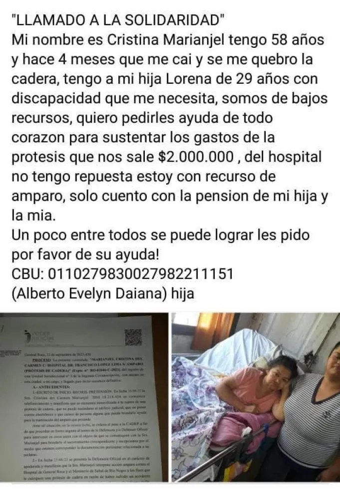 Hace cuatro meses que una mujer sin recursos esta postrada esperando una prótesis Regionales Rio Negro Roca por rocanoticias - 05/10/20230 Una triste realidad, la que atraviesa una vecina de General Roca, que se encuentra postrada en una cama esperando que el estado le consiga una prótesis de cadera.Según expresaron desde su familia, la mujer tiene 58 años y se encuentra al cuidado de una hija con discapacidad, que requiere de su asistencia. La mujer se cayó y sufrió la quebradura de su cadera.Cansada de esperar, y sin ningún tipo de recursos económicos, la mujer promovió un amparo de salud, desde la defensoría pública, y ahora busca visibilizar la situación para que acelerar el trámite.Según le información del hospital de Roca y de Salud Pública, las restricciones a las importaciones, decretadas por el gobierno nacional, se encuentran impidiendo el acceso a la compra de insumos, prótesis y demás elementos sanitarios que no se fabrican en el país. La mujer pertenece a un grupo socialmente vulnerable, y no cuenta con ningún tipo de recurso o asistencia estatal, por lo que solicita ayuda a todos los vecinos que puedan colaborar.En resumen:Resumen en español del contenido en 200 palabrasUna triste realidad, la que atraviesa una vecina de General Roca, que se encuentra postrada en una cama esperando que el estado le consiga una prótesis de cadera.Según expresaron desde su familia, la mujer tiene 58 años y se encuentra al cuidado de una hija con discapacidad, que requiere de su asistencia. La mujer se cayó y sufrió la quebradura de su cadera.Cansada de esperar, y sin ningún tipo de recursos económicos, la mujer promovió un amparo de salud, desde la defensoría pública, y ahora busca visibilizar la situación para que acelerar el trámite.Según le información del hospital de Roca y de Salud Pública, las restricciones a las importaciones, decretadas por el gobierno nacional, se encuentran impidiendo el acceso a la compra de insumos, prótesis y demás elementos sanitarios que no se fabrican en el país. La mujer pertenece a un grupo socialmente vulnerable, y no cuenta con ningún tipo de recurso o asistencia estatal, por lo que solicita ayuda a todos los vecinos que puedan colaborar. en españolRocaNoticias.com en Redes Sociales con información al instante! Facebook.com/RocaNoticiasOK Twitter.com/RocaNoticiasOK Youtube.com/@RocaNoticias Instagram.com/RocaNoticiasOK Telegram.me/RocaNoticias TikTok.com/@RocaNoticiasCompartir esta noticia:Tweet Haz clic para compartir en WhatsApp (Se abre en una ventana nueva) WhatsApp Haz clic para compartir en Telegram (Se abre en una ventana nueva) Telegram Haz clic para compartir en Reddit (Se abre en una ventana nueva) Reddit Haz clic para imprimir (Se abre en una ventana nueva) Imprimir Relacionado...
