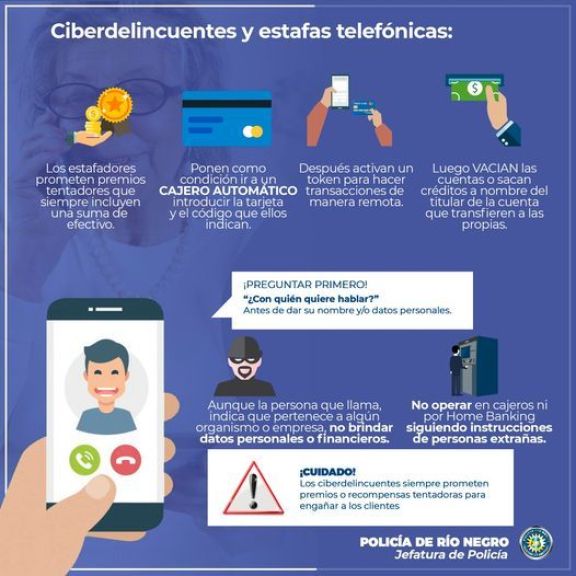 Información importante: mirá estas recomendaciones para evitar ser víctima de estafas Regionales Roca por rocanoticias - 13/05/20230 La ciberdelincuencia y las estafas telefónicas son un delito que crece día a día. Es por ello que, con el objetivo de prevenir posibles engaños virtuales, desde la Policía de Río Negro brindaron las siguientes recomendaciones:Este tipo de estafas se caracterizan porque los delincuentes se comunican con las víctimas y prometen premios tentadores que siempre incluyen una suma en efectivo.... : Un preso de Roca organizaba junto a su pareja estafas con tarjetasPonen como condición ir a un cajero automático, introducir la tarjeta y el código que ellos indican.Finalmente, activan un token para hacer transacciones de manera remota.Ante esto se recomienda: Preguntar primero con quién quiere hablar antes de dar su nombre y/o datos personales. Aunque la persona que llama indica que pertenece a algún organismo o empresa, no brindar datos personales o financieros. No operar en cajeros ni por home banking siguiendo instrucciones de personas extrañas.¡Cuidado!: los ciberdelincuentes siempre prometen premios o recompensas tentadoras para engañar a los clientes.En resumen:Resumen en español del contenido en 180 palabras La ciberdelincuencia y las estafas telefónicas son un delito que crece día a día. Es por ello que, con el objetivo de prevenir posibles engaños virtuales, desde la Policía de Río Negro brindaron las siguientes recomendaciones:Este tipo de estafas se caracterizan porque los delincuentes se comunican con las víctimas y prometen premios tentadores que siempre incluyen una suma en efectivo.... : Un preso de Roca organizaba junto a su pareja estafas con tarjetasPonen como condición ir a un cajero automático, introducir la tarjeta y el código que ellos indican.Finalmente, activan un token para hacer transacciones de manera remota.Ante esto se recomienda: Preguntar primero con quién quiere hablar antes de dar su nombre y/o datos personales. Aunque la persona que llama indica que pertenece a algún organismo o empresa, no brindar datos personales o financieros. No operar en cajeros ni por home banking siguiendo instrucciones de personas extrañas.¡Cuidado!: los ciberdelincuentes siempre prometen premios o recompensas tentadoras para engañar a los clientes.RocaNoticias.com en Redes Sociales con información al instante! Facebook.com/RocaNoticiasOK Twitter.com/RocaNoticiasOK Youtube.com/@RocaNoticias Instagram.com/RocaNoticiasOK Telegram.me/RocaNoticias TikTok.com/@RocaNoticiasGentileza anrCompartir esta noticia:Tweet Haz clic para compartir en WhatsApp (Se abre en una ventana nueva) WhatsApp Haz clic para compartir en Telegram (Se abre en una ventana nueva) Telegram Haz clic para compartir en Reddit (Se abre en una ventana nueva) Reddit Haz clic para imprimir (Se abre en una ventana nueva) Imprimir Relacionado...