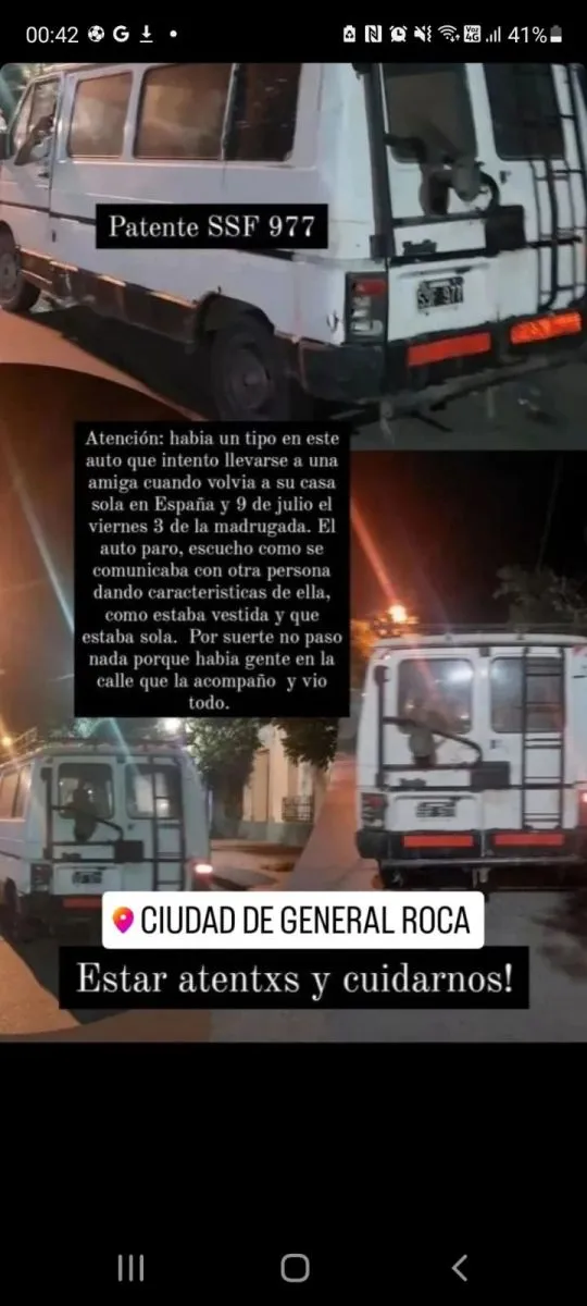 Intentaron secuestrar a una joven durante la madrugada Regionales Roca por rocanoticias - 10/12/20230 Una joven de General Roca fue víctima de un intento de secuestro durante la madrugada del pasado sábado. El incidente ocurrió en pleno centro de la ciudad cerca de las 03:00 cuando la víctima se dirigía a su hogar por las transitadas calles España y 9 de Julio.El vehículo involucrado en el presunto intento de secuestro fue una combi con la patente SSF-977. Según el relato de la joven, el conductor de la combi detuvo bruscamente el vehículo, aparentemente con la intención de secuestrarla.La situación se tornó aún más alarmante cuando la víctima escuchó al conductor comunicarse con otra persona, informando que la joven estaba sola y proporcionando detalles específicos sobre ella.Afortunadamente, la joven no estuvo sola en este aterrador momento. Testigos presentes en la escena intervinieron rápidamente al percatarse de la situación, brindando apoyo y acompañamiento a la potencial víctima. La denuncia ha generado una mayor alerta en la comunidad roquense, instando a la población a permanecer vigilante y reportar cualquier actividad sospechosa a la policía. Este incidente resalta la importancia de la solidaridad y la pronta acción ciudadana para enfrentar situaciones de peligro. En resumen:Resumen del contenido en 180 palabras Una joven de General Roca fue víctima de un intento de secuestro durante la madrugada del pasado sábado. El incidente ocurrió en pleno centro de la ciudad cerca de las 03:00 cuando la víctima se dirigía a su hogar por las transitadas calles España y 9 de Julio.El vehículo involucrado en el presunto intento de secuestro fue una combi con la patente SSF-977. Según el relato de la joven, el conductor de la combi detuvo bruscamente el vehículo, aparentemente con la intención de secuestrarla.La situación se tornó aún más alarmante cuando la víctima escuchó al conductor comunicarse con otra persona, informando que la joven estaba sola y proporcionando detalles específicos sobre ella.Afortunadamente, la joven no estuvo sola en este aterrador momento. Testigos presentes en la escena intervinieron rápidamente al percatarse de la situación, brindando apoyo y acompañamiento a la potencial víctima. La denuncia ha generado una mayor alerta en la comunidad roquense, instando a la población a permanecer vigilante y reportar cualquier actividad sospechosa a la policía. Este incidente resalta la importancia de la solidaridad y la pronta acción ciudadana para enfrentar situaciones de peligro. en español Resumen del contenido en 180 palabras Una joven de General Roca fue víctima de un intento de secuestro durante la madrugada del pasado sábado. El incidente ocurrió en pleno centro de la ciudad cerca de las 03:00 cuando la víctima se dirigía a su hogar por las transitadas calles España y 9 de Julio.El vehículo involucrado en el presunto intento de secuestro fue una combi con la patente SSF-977. Según el relato de la joven, el conductor de la combi detuvo bruscamente el vehículo, aparentemente con la intención de secuestrarla.La situación se tornó aún más alarmante cuando la víctima escuchó al conductor comunicarse con otra persona, informando que la joven estaba sola y proporcionando detalles específicos sobre ella.Afortunadamente, la joven no estuvo sola en este aterrador momento. Testigos presentes en la escena intervinieron rápidamente al percatarse de la situación, brindando apoyo y acompañamiento a la potencial víctima. La denuncia ha generado una mayor alerta en la comunidad roquense, instando a la población a permanecer vigilante y reportar cualquier actividad sospechosa a la policía. Este incidente resalta la importancia de la solidaridad y la pronta acción ciudadana para enfrentar situaciones de peligro. en españolRocaNoticias.com en Redes Sociales con información al instante! Facebook.com/RocaNoticiasOK Twitter.com/RocaNoticiasOK Youtube.com/@RocaNoticias Instagram.com/RocaNoticiasOK Telegram.me/RocaNoticias TikTok.com/@RocaNoticiasGentileza anrCompartir esta noticia:Tweet Haz clic para compartir en WhatsApp (Se abre en una ventana nueva) WhatsApp Haz clic para compartir en Telegram (Se abre en una ventana nueva) Telegram Haz clic para compartir en Reddit (Se abre en una ventana nueva) Reddit Haz clic para imprimir (Se abre en una ventana nueva) Imprimir Relacionado...