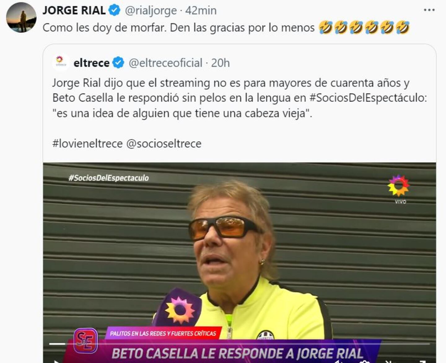 Jorge Rial vs Beto Casella: La guerra de los titanes mediáticos Regionales por rocanoticias - 04/05/20240 La batalla entre los reconocidos periodistas Jorge Rial y Beto Casella sumó un nuevo capítulo este viernes, luego del lanzamiento de un nuevo canal de streaming. La polémica se desató a raíz de un comentario de Rial en el programa Socios del Espectáculo, donde hizo referencia a lo que su colega había escrito en la red social X.Sin demorarse, Rial utilizó sus redes sociales para contestar a los dichos de Casella. «¡Cómo les doy de morfar! Den las gracias por lo menos», expresó el conductor de Bendita junto a la nota del programa de Adrián Pallares y Rodrigo Lussich.Pero las provocaciones no quedaron allí, Rial continuó con sus polémicas declaraciones. En un nuevo post, afirmó que Migue Granados es «el puto amo» y que Nicolás Occhiato fue el primero en darse cuenta de ello, dejando implícito que el resto de los participantes son solo «buenos extras«.La polémica se acrecentó cuando un usuario de la red social X cuestionó la viabilidad de los streamings y su audiencia en comparación con la televisión tradicional. Rial, sin titubeos, respondió dejando entrever cierta duda sobre el fenómeno: «No soy un experto. Pero es un fenómeno que hay que tener en cuenta y valorar. Lo que digo es que no es para cualquiera. Hay que reconocer los límites. A los números me remito».Sin embargo, retornemos al inicio de esta disputa mediática. Casella había desembarcado en Bondi, el mencionado canal de streaming, lo que generó el primer cruce con Rial. El conductor de Intrusos arremetió contra este nuevo proyecto y afirmó: «El streaming no es para mayores de 40. No hagan el ridículo. Quiéranse un poco. Dejen a los pibes».Casella no se amedrentó frente a las palabras de su colega y respondió a través del programa Socio del Espectáculo. En una entrevista, el periodista tildó de «estupidez total» la idea de Rial y lo acusó de tener «una cabeza vieja». Además, sostuvo que algunos periodistas se habían sumado a la controversia porque se estaban quedando fuera de los medios tradicionales y no les quedaba otra opción que retirarse.La guerra de titanes entre Rial y Casella parece no tener fin. Los ataques, las declaraciones explosivas y las provocaciones se suceden una y otra vez en redes sociales y programas de televisión. ¿Hasta dónde llegarán? Solo el tiempo lo dirá.RocaNoticias.com en Redes Sociales con información al instante! Facebook.com/RocaNoticiasOK Twitter.com/RocaNoticiasOK Youtube.com/@RocaNoticias Instagram.com/RocaNoticiasOK Telegram.me/RocaNoticias TikTok.com/@RocaNoticiasCompartir esta noticia:Tweet Haz clic para compartir en WhatsApp (Se abre en una ventana nueva) WhatsApp Haz clic para compartir en Telegram (Se abre en una ventana nueva) Telegram Haz clic para compartir en Reddit (Se abre en una ventana nueva) Reddit Haz clic para imprimir (Se abre en una ventana nueva) Imprimir Relacionado...