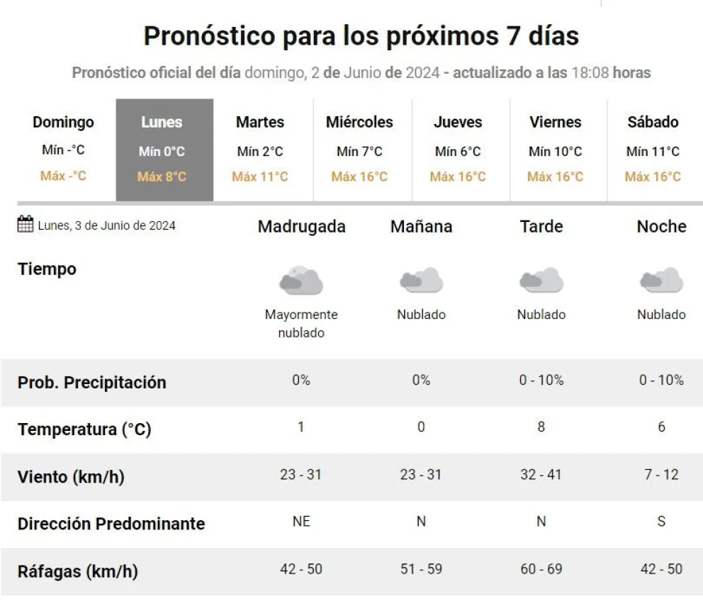 La primera semana de junio arranca con un lunes ventoso, enterate las temperaturas para la región Regionales por rocanoticias - 03/06/20240 El frío seguirá presente en el Alto Valle, por lo menos hasta el martes inclusivo. A mitad de semana, las máximas se elevan algunos grados hasta el sábado. Para el primer día hábil de junio, el viento sería un factor determinante.Para hoy anunciaron cielo mayormente nublado, con vientos moderados del noreste, rotando al norte, hasta 41 km/h, con ráfagas de hasta 69 km/h durante la tarde. Disminuye su velocidad hacia la noche y rota al sur. La mínima será de 0° y la máxima de 8°.Para mañana el cielo sigue mayormente nublado, viento leve del sudoeste rotando al oeste. La temperatura mínima estará en los 2° y la máxima en 11°.Para el resto de la semana se anunció cielo parcialmente nublado a nublado, con inestabilidad desde el miércoles al viernes y máximas que estarían en los 16° a 18°, hasta el sábado inclusive.RocaNoticias.com en Redes Sociales con información al instante! Facebook.com/RocaNoticiasOK Twitter.com/RocaNoticiasOK Youtube.com/@RocaNoticias Instagram.com/RocaNoticiasOK Telegram.me/RocaNoticias TikTok.com/@RocaNoticiasCompartir esta noticia:Tweet Haz clic para compartir en WhatsApp (Se abre en una ventana nueva) WhatsApp Haz clic para compartir en Telegram (Se abre en una ventana nueva) Telegram Haz clic para compartir en Reddit (Se abre en una ventana nueva) Reddit Haz clic para imprimir (Se abre en una ventana nueva) Imprimir Relacionado...