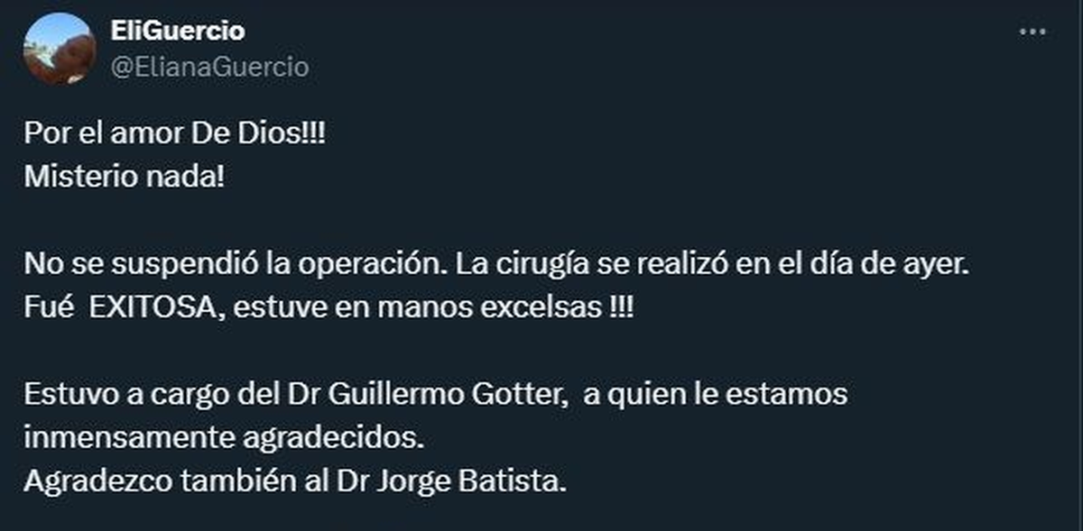 Lesión de Eliana Guercio: el relato de su operación Regionales por rocanoticias - 04/05/20240 La reconocida modelo Eliana Guercio sorprendió a todos al revelar los detalles de la gravísima lesión que sufrió en su tobillo derecho y cómo fue su difícil operación. La esposa del arquero Sergio Romero, quien se encontraba cerca del hotel donde el plantel de Boca se hospedaba para disputar un partido, contó cómo logró sobrellevar la situación y agradeció especialmente a los médicos del club xeneize que estuvieron a su lado.Tras el incidente, Eliana decidió romper el silencio y aclarar los rumores que surgieron alrededor de su operación. Mediante su cuenta personal de X, la panelista desmintió categóricamente los rumores de suspensión y compartió detalles sobre el exitoso procedimiento quirúrgico. «Estoy bien. Me rompí toda, pero agradezco infinitamente al Dr. Guillermo Gotter y al Dr. Jorge Batista, quienes estuvieron a cargo de mi cirugía», expresó la valiente mujer.La modelo no dudó en elogiar y resaltar el profesionalismo de los especialistas de Boca, quienes supieron brindarle contención e hizo más llevadero el difícil momento. «Fueron unos genios totales. Gracias a ellos, todo fue menos doloroso y más fácil», manifestó con gratitud.Pero la recuperación no ha sido lo único agitado en la vida de Eliana en los últimos días. Además de su fractura y operación, la panelista protagonizó un fuerte cruce en el debate de Gran Hermano. Junto a Laura Ubfal, cuestionaron el juego de Coti Romero en el reality, lo que desató un enfrentamiento con el polémico panelista Ceferino Reato.El choque de opiniones se intensificó cuando Reato tildó de «misóginas» a Guercio y Ubfal. La modelo, enérgicamente, no tardó en responder y dejar en claro que no toleraría la falta de respeto. «No te voy a permitir que me faltes el respeto nunca más llamándome así. No te conozco, pero no voy a permitir que te atribuyas ese derecho», expresó Eliana, visiblemente enojada.La discusión entre ambos panelistas llegó a su punto máximo, donde Guercio acusó a Reato de odiar a las mujeres y de haber dicho cosas terribles sobre ella en el pasado. La tensión se mantuvo hasta el final, dejando en claro que la fortaleza de Eliana va más allá de sus lesiones físicas.En resumen, Eliana Guercio reveló los pormenores de su difícil lesión y operación, agradeciendo a los médicos de Boca por su profesionalismo. Además, protagonizó un tenso enfrentamiento en el debate de Gran Hermano, defendiéndose de acusaciones y demostrando su fortaleza no solo física, sino también emocional.RocaNoticias.com en Redes Sociales con información al instante! Facebook.com/RocaNoticiasOK Twitter.com/RocaNoticiasOK Youtube.com/@RocaNoticias Instagram.com/RocaNoticiasOK Telegram.me/RocaNoticias TikTok.com/@RocaNoticiasCompartir esta noticia:Tweet Haz clic para compartir en WhatsApp (Se abre en una ventana nueva) WhatsApp Haz clic para compartir en Telegram (Se abre en una ventana nueva) Telegram Haz clic para compartir en Reddit (Se abre en una ventana nueva) Reddit Haz clic para imprimir (Se abre en una ventana nueva) Imprimir Relacionado...