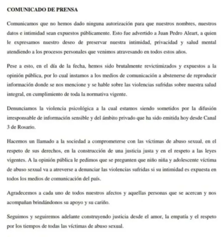 En el comunicado, afirmaron que no dieron su autorización para que se expusieran públicamente sus nombres, datos personales y su intimidad. Alegan que Juan Pedro era consciente de la postura de querer preservar su intimidad y salud mental, y que se sienten brutalmente revictimizados y expuestos frente a la opinión pública.