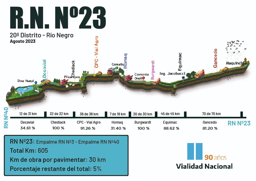 La estratégica ruta nacional 23, que une la ruta 3 (cerca de San Antonio Oeste) con Dina Huapi y Bariloche es un verdadero sueño para muchos rionegrinos.La RN 23 es un corredor clave tiene una extensión de 605 km, llega a los ejidos urbanos de las localidades de Valcheta, Sierra Colorada, Los Menucos, Maquinchao, Ing. Jacobacci, Clemente Onelli, Comallo, Pilcaniyeu y Dina Huapi.Pero además, esta vía permite conectar el Alto Valle de Río Negro con esa vía a través de la ruta provincial 6, cruzando el río Negro en General Roca, en Paso Córdoba, pasando por El Cuy y unirse a la ruta nacional en Los Menucos.Gran parte de los trabajos viales se desarrollan entre Los Menucos e intersección ruta nacional 40, a lo largo de 316 kilómetros.