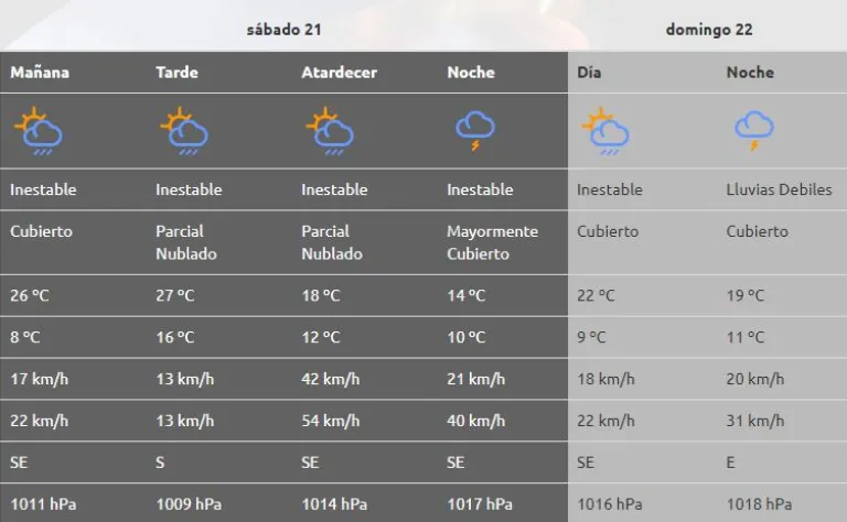 Pronóstico con tormenta y lluvia este fin de semana en Roca: cuándo empieza Regionales Roca por rocanoticias - 21/10/20230 Según la Autoridad Interjurisdiccional de las Cuencas, este sábado 21 de octubre tendrá el siguiente pronóstico:Ingreso de aire húmedo y cálido sobre el norte de la Patagonia, provoca períodos nubosos, inestabilidad durante el fin de semana, viento moderado del noreste. Probables lluvias con chaparrones de variada intensidad. A partir del domingo 22, viento del sudeste y descenso de la temperatura.En resumen:Resumen del contenido en 180 palabras Según la Autoridad Interjurisdiccional de las Cuencas, este sábado 21 de octubre tendrá el siguiente pronóstico:Ingreso de aire húmedo y cálido sobre el norte de la Patagonia, provoca períodos nubosos, inestabilidad durante el fin de semana, viento moderado del noreste. Probables lluvias con chaparrones de variada intensidad. A partir del domingo 22, viento del sudeste y descenso de la temperatura. en español Resumen del contenido en 180 palabras Según la Autoridad Interjurisdiccional de las Cuencas, este sábado 21 de octubre tendrá el siguiente pronóstico:Ingreso de aire húmedo y cálido sobre el norte de la Patagonia, provoca períodos nubosos, inestabilidad durante el fin de semana, viento moderado del noreste. Probables lluvias con chaparrones de variada intensidad. A partir del domingo 22, viento del sudeste y descenso de la temperatura. en españolRocaNoticias.com en Redes Sociales con información al instante! Facebook.com/RocaNoticiasOK Twitter.com/RocaNoticiasOK Youtube.com/@RocaNoticias Instagram.com/RocaNoticiasOK Telegram.me/RocaNoticias TikTok.com/@RocaNoticiasGentileza anrCompartir esta noticia:Tweet Haz clic para compartir en WhatsApp (Se abre en una ventana nueva) WhatsApp Haz clic para compartir en Telegram (Se abre en una ventana nueva) Telegram Haz clic para compartir en Reddit (Se abre en una ventana nueva) Reddit Haz clic para imprimir (Se abre en una ventana nueva) Imprimir Relacionado...