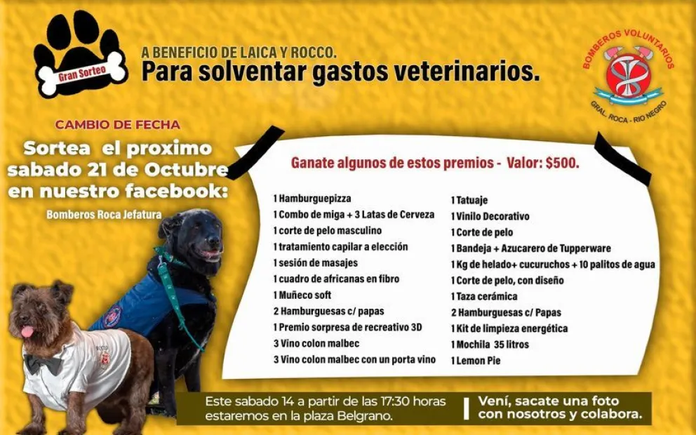 Desde Bomberos Voluntarios de Roca están llevando a cabo una rifa solidaria para solventar los gastos veterinarios de Laica y Rocco, compañeros de cuatro patas del Cuartel Central de la ciudad.