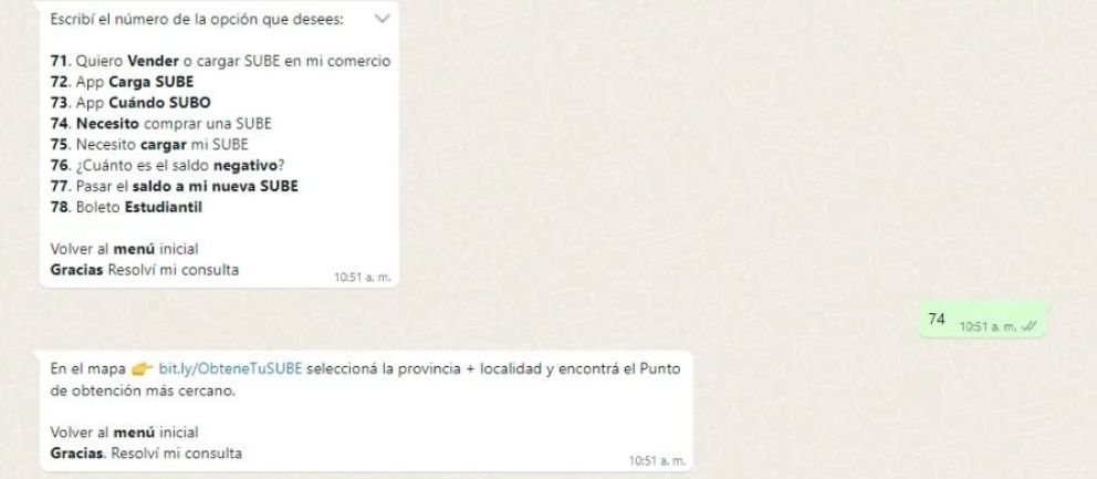 Tarjeta Sube: en Roca se paga el adicional de recarga y en Cipolletti lo prohibieron Regionales Rio Negro Roca por rocanoticias - 07/06/20220 Tarjeta Sube: en Roca se paga el adicional de recarga y en Cipolletti lo prohibieron : Los kioskos de Roca agregan un adicional de 30 pesos por el servicio al momento de cargar la tarjeta, algo que Cipolletti estará prohibido tras el consenso que hubo para adherir a una ley provincial. Tampoco se permitirá exigir la compra de algunos productos por efectuar el servicio. Algo que se esperaba del Sistema Único de Boleto Electrónico, conocido como SUBE, era que se implemente un canal de WhatsApp para que puedan resolver dudas y problemas. Ahora el bot denominado “Subi” responde a las preguntas más frecuentes de los usuarios, como por ejemplo dónde comprar la tarjeta, dónde cargarle saldo o incluso hasta qué monto es el saldo negativo. De esta forma, en unos simples pasos todas las personas que cuenten con Whatsapp podrán tener de forma simple y sencilla toda la información necesaria sobre la tarjeta. A continuación, cómo funciona el chatbot SUBi:– Agendá al chatbot SUBi. El número es +54 9 11-6677-7823o cliquea acá para mandarle un mensaje– Mandá cualquier mensaje para comenzar el chat. SUBi responderá de la siguiente manera: – Escribí el número correspondiente para que SUBi responda la consulta. En caso de que no figure entre las opciones, escribir «7» para más consultas.– Escribí «Menú» en caso de tener otra duda sobre SUBE o «Gracias» para dar por finalizado el chat.Al consultar dónde comprar la tarjeta SUBE, el bot te brinda la opción de acceder a un mapa por provincia y localidad en donde se pueden ver todos los lugares para comprar el plástico. Incluso, al notificar que hubo un problema (opción 6) , se puede conocer el stock disponible y así no perder tiempo. En esta misma opción se puede denunciar que un negocio cobró más cara la tarjeta, que actualmente se vende al precio oficial de 90 pesos. Gentileza anrEstamos en Redes Sociales también con información al instante! Facebook.com/RocaNoticiasOK Twitter.com/RocaNoticiasOK Youtube.com/channel/UCBynBbRhpBSthnlTdU0ugYg Instagram.com/RocaNoticiasOK Telegram.me/RocaNoticias TikTok.com/@RocaNoticiasCompartir esta noticia:Tweet Haz clic para compartir en WhatsApp (Se abre en una ventana nueva) WhatsApp Haz clic para compartir en Telegram (Se abre en una ventana nueva) Telegram Haz clic para compartir en Reddit (Se abre en una ventana nueva) Reddit Haz clic para imprimir (Se abre en una ventana nueva) Imprimir Relacionado...