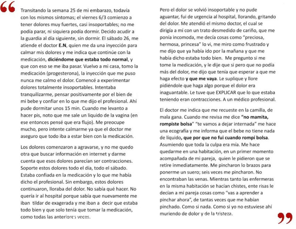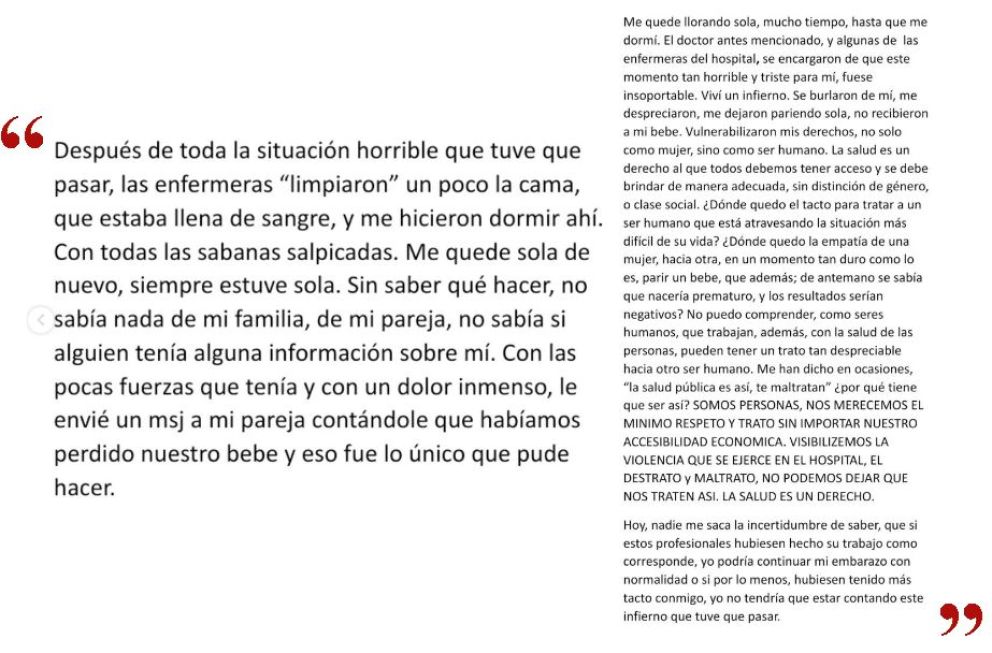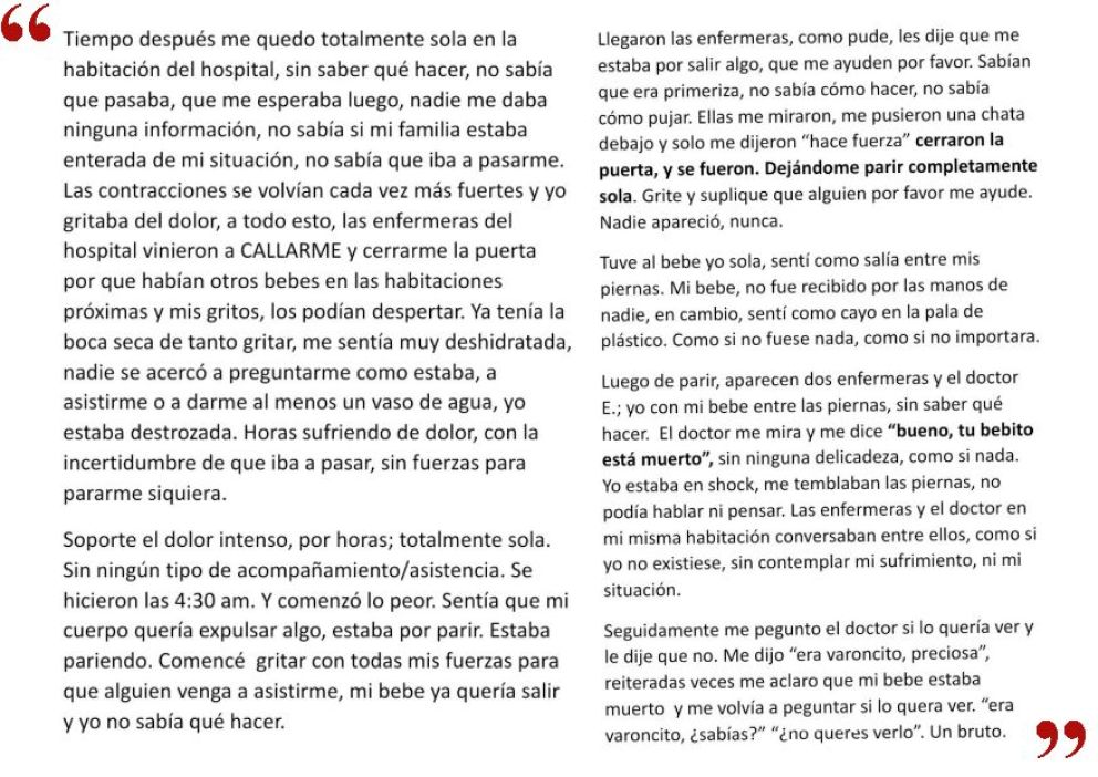 Violencia obstétrica: Se viralizó una denuncia pública contra profesionales del Hospital de Roca Regionales Rio Negro Roca por rocanoticias - 09/03/20220 Violencia obstétrica: Se viralizó una denuncia pública contra profesionales del Hospital de Roca: A raíz del 8M, trascendieron relatos relacionados con situaciones de violencia de género en la región. Uno de ellos fue un descargo contra profesionales del Hospital Francisco López Lima por un caso de violencia obstétrica, denunciado por Melina González en la red social Instagram. La Ley 25.929 establece que la violencia obstétrica es aquella que ejerce el personal de salud sobre el cuerpo y los procesos reproductivos de las mujeres, «expresada en un trato deshumanizado, un abuso de medicalización y patologización de los procesos naturales».Consultada por un medio roquenseoca respecto de la denuncia, la directoria del Hospital, Ana Senesi, respondió: «Se está haciendo el proceso que corresponde a la investigación». En su relato, González, la joven de 20 años que hace la denuncia pública, explica que sus vivencias traumáticas habrían comenzado mientras transitaba su semana 20 de gestación, hace menos de un mes. En ese momento acudió al nosocomio local para consultar sobre perdidas de sangre. Allí, cuenta que los profesionales de salud que la atendieron habrían desestimado su preocupación sobre las pérdidas y la habrían enviado de nuevo a su casa. González expresa su preocupación por el bienéstar de su bebe y relata que acudió en reiteradas ocasiones al lugar hasta que en la semana 24 comenzó a sentir dolores en el útero. Asustada por las contracciones, una vez más fue al lugar y según cuenta le suministraron medicamentos para calmar sus dolencias. Como los dolores se volvieron insoportables, buscó en Google sus síntomas y allí identificó que estaba sufriendo contracciones. Con miedo de que la trataran de «exagerada», contó que acudió una vez más al Hospital a pedir que la revisaran. Allí, finalmente se enteró que había roto bolsa y el ginecólogo que la atendió la habría culpabilizado de no haber ido antes a atenderse. A continuación, la joven cuenta la traumática experiencia de parto que atravesó. Relató que fue dejada sola en la habitación, que nadie le habría explicado lo que sucedía y que finalmente su bebé nació sin vida. Incluso, refirió, le habrían insistido en que viese al bebé fallecido, sin respetar su duelo y sin recibir un trato humanizado.Finalmente, termina su descargo contando las secuelas emocionales que sufrió a causa de la pérdida de su bebe y pidiendo por un trato más respetuoso, humanizado y cuidado para las personas que deben atenderse en la salud pública. Gentileza anrEstamos en Redes Sociales también con información al instante! Facebook.com/RocaNoticiasOK Twitter.com/RocaNoticiasOK Youtube.com/channel/UCBynBbRhpBSthnlTdU0ugYg Instagram.com/RocaNoticiasOK Telegram.me/RocaNoticiasCompartir esta noticia:Tweet Haz clic para compartir en WhatsApp (Se abre en una ventana nueva) WhatsApp Haz clic para compartir en Telegram (Se abre en una ventana nueva) Telegram Haz clic para compartir en Reddit (Se abre en una ventana nueva) Reddit Haz clic para imprimir (Se abre en una ventana nueva) Imprimir Relacionado...