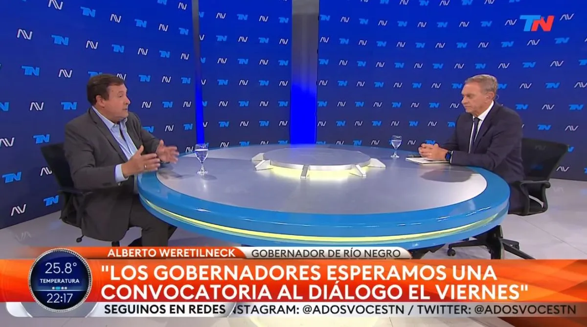Weretilneck: “Las provincias no somos responsables de la debacle argentina” Regionales por rocanoticias - 29/02/20240 El gobernador de Río Negro, Alberto Weretilneck, participó en la noche del miércoles del programa político “A Dos Voces”, que conduce Marcelo Bonelli. Allí dejó varias frases de alto voltage, en medio de la crisis entre el gobierno de Javier Milei y las provincias patagónicas.“Las provincias no somos responsables de la debacle argentina: apenas el 5% de la deuda que acumula el país le corresponde a las provincias. Nosotros no somos causantes de la inflación descontrolada, nosotros garantizamos en el interior los servicios de educación, seguridad y salud”, sostuvo. “Que nos castiguen a las provincias y nos quieran hacer responsables es injusto e inadmisible”, agregó.El mandatario rionegrino remarcó en varias ocasiones que la crisis que atraviesa el país es producto de las malas decisiones de los gobiernos nacionales y los grandes partidos que se alternan el poder. “La crisis no es responsabilidad de las provincias, todo lo contrario, el interior genera divisas, aportamos la energía, los granos, la minería, y el turismo”, señaló.En ese sentido, acotó: “Es muy injusto que quieran responsabilizar a las provincias del estado actual de la Nación. Las malas decisiones que adoptaron los distintos gobiernos nacionales no tienen que ver con nosotros, porque nosotros no tomamos decisiones, ni fuimos causante de esta crisis económica”.Weretilneck exigió diálogo y pidió respeto. “Si hay un cese de la agresión a las provincias desde el punto de vista político, personal y económico, y se pueden discutir algunas leyes junto con los ingresos que nos corresponden a las provincias, creo que es posible establecer un diálogo. Pero hace falta diálogo y respeto”, remarcó.“Se tienen que terminar los agravios y las persecuciones a quienes pensamos distinto. Tenemos que encontrar un acuerdo que nos sirva a todos. Los gobernadores estamos muy molestos por los ataques, la injusticia de querer hacernos cargo de algo que no generamos, y además hay mucha incertidumbre porque no hay ámbito de discusión de los temas más importantes de nuestro pueblo”, amplió.Luego, indicó: “Todas las personas que piensan distinto al gobierno son atacadas. Es una actitud ideológica muy peligrosa. Primero fueron víctimas los dirigentes gremiales, luego los diputados y senadores, después fuimos los gobernadores, los artistas y ahora los periodistas. Toda aquella persona que piensa distinto al gobierno es estigmatizada públicamente y atacada en redes sociales”.Finalmente dijo que “el presidente Javier Milei ve una realidad que el resto no vemos: el empobrecimiento, el encarecimiento exponencial del costo de vida, el desempleo, y el cierre de comercios lo vemos todos los días en el interior del país. Tal vez él (por Milei) esté viendo algo que nosotros en la realidad diaria no estamos viendo”.RocaNoticias.com en Redes Sociales con información al instante! Facebook.com/RocaNoticiasOK Twitter.com/RocaNoticiasOK Youtube.com/@RocaNoticias Instagram.com/RocaNoticiasOK Telegram.me/RocaNoticias TikTok.com/@RocaNoticiasCompartir esta noticia:Tweet Haz clic para compartir en WhatsApp (Se abre en una ventana nueva) WhatsApp Haz clic para compartir en Telegram (Se abre en una ventana nueva) Telegram Haz clic para compartir en Reddit (Se abre en una ventana nueva) Reddit Haz clic para imprimir (Se abre en una ventana nueva) Imprimir Relacionado...