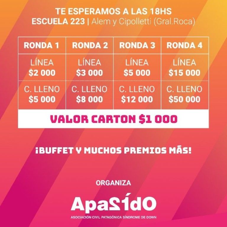 ¿Ya tenés plan para el finde? Se viene el bingo solidario de Apasido Regionales Rio Negro Roca por rocanoticias - 08/11/20220 ¿Ya tenés plan para el finde? Se viene el bingo solidario de Apasido:Se trata de una oportunidad de colaborar con una institución que hace muchas cosas por la comunidad, pasar un buen rato y, de paso, tener la oportunidad de ganar unos pesos. Algo que a nadie la viene mal. La APASIDO, la Asociación Patagónica de Síndrome de Down, está organizando un bigno solidario para este sábado, 12 de noviembre.La actividad se realizará en la Escuela N° 223 (Alem y Cipolletti), a partir de las 18 hs. Los cartones pueden adquirirse en Casa Luchetto (Tucumán 988), o con alguno de los integrantes de la Asociación. Tienen un costo de 1.000 pesos cada uno, y habrá servicio de buffet.En la primera ronda, el premio para la primera línea será de $ 2.000 y para el cartón lleno de $ 5.000. En la segunda ronda subirá a 3.000 y 8.000; en la tercera, a 5.000 y 12.000; y en la cuarta ronda, a 15.000 y 50.000 pesos.Leé también: Apasido: 11 años capacitando para el empleo a personas con discapacidadApasido es una asociación de padres, amigos y familiares de personas con síndrome de down. Su objetivo es promocionar la autonomía de cada integrante y persona con discapacidad que llega a la asociación. Su sede central está ubicada en Adolfo Alsina 1711, de nuestra ciudad. Y está construyendo una filial en el barrio Arévalo de Cipolletti.“Actualmente trabajamos con más de 20 chicas y chicos en formación laboral. Recibimos de parte del Ministerio de Desarrollo Humano y Articulación Solidaria un aporte económico muy importante, que nos ayudará a afrontar gastos de funcionamiento y actividades de la Asociación”, indicó la referente de la institución, Ana Heredia.Para aumentar las posibilidades de capacitación y formación cuentan con el respaldo de la provincia, que con el programa Gestos facilita espacios con talleristas.Gentileza anrEstamos en Redes Sociales también con información al instante! Facebook.com/RocaNoticiasOK Twitter.com/RocaNoticiasOK Youtube.com/channel/UCBynBbRhpBSthnlTdU0ugYg Instagram.com/RocaNoticiasOK Telegram.me/RocaNoticias TikTok.com/@RocaNoticiasCompartir esta noticia:Tweet Haz clic para compartir en WhatsApp (Se abre en una ventana nueva) WhatsApp Haz clic para compartir en Telegram (Se abre en una ventana nueva) Telegram Haz clic para compartir en Reddit (Se abre en una ventana nueva) Reddit Haz clic para imprimir (Se abre en una ventana nueva) Imprimir Relacionado...